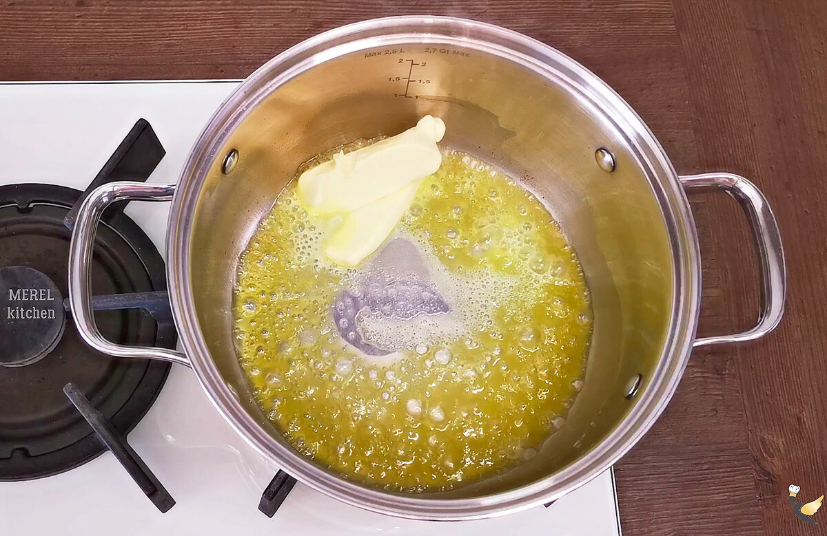 Для приготовления Турецкого чечевичного супа я нагреваю в кастрюле объемом 2,5 литра две столовые ложки оливкового масла и добавляю к нему сливочное масло 50 граммов.