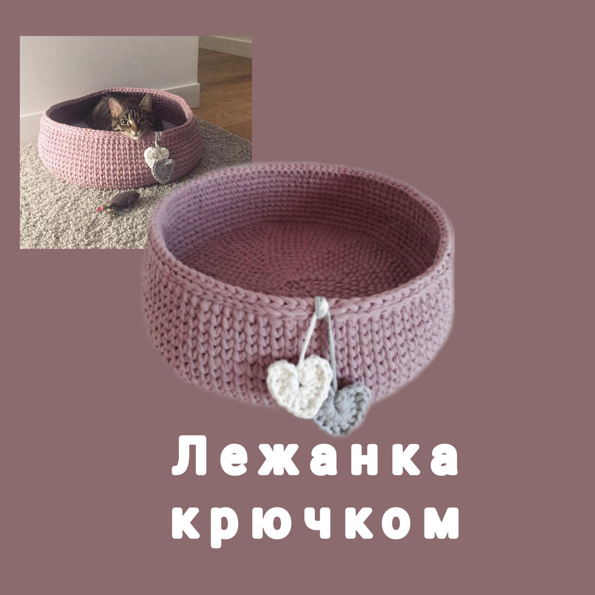 Эту лежанку я вязала на заказ. Вяжется очень просто, как обычная круглая корзина из трикотажной пряжи, только диаметр донышка значительно шире . Также, внутрь я связала ещё мягкий вкладыш - матрасик из плюшевой пряжи : связала два кружка, сшила и набила небольшим колличеством синтепуха. Плюсы такой лежанки : - цвет можно подбрать под ваш интерьер - можно стирать.