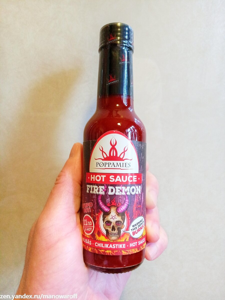 Мне уже доводилось пробовать острые соусы костариканской компании Poppamies - парочка из них были довольно острыми (10 из 10 по шкале производителя), но особо интересными вкусами не отличались. Ну а сегодня будем дегустировать соус Fire Demon, которому компания присвоила одиннадцатый уровень остроты по десятибальной шкале. Это интересно. Еще интересней будет, если соус окажется и вкусным. А судя по составу, вкус должен быть неплохим: Ладно, посмотрим, что производитель расскажет нам о своем соусе и будем пробовать: Fire Demon - безумно огненный соус чили. Мы рекомендуем трогать этого демона только длинной палкой и по капле за раз. Те, кто вытерпят ожог демона, будут вознаграждены великолепным вкусом! Сколько раз я уже читал подобные устрашающие описания. А в итоге оказывалось, что соус можно из горла пить (не всегда, но частенько). Соус темно-красного цвета, довольно густой, равномерной консистенции (т.е. без мелких кусочков фруктов и перцев). Несмотря на отсутствие дозатора вряд ли п