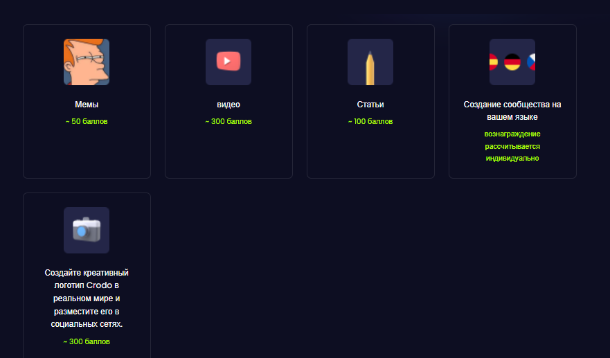 Всем привет и сегодня я расскажу как стать послом crodo.io Чтобы стать им нужно заполнить форму на их сайте и ожидать. В течении 3-5 дней ответят. Ссылка на заполнение формы (кликабельно) Заполнив форму и получив ответ, вы сможете начать выполнять задания за которые будут давать очки и из количества очков будет определяться количество токенов которые вы получите в конце амбассадорской программы. Вот такие задания сейчас по каждому из них пробежимся. 1. Мемы - самое лёгкое и простое задание, просто находите шаблон мема в поисковике и вставляете фразу, которая будет и смешной и подходящей по смыслу. Дают за один мем в среднем 50 очков. 2. Видео - самое высокооплачиваемое задание из всех. Чтобы его выполнить вам нужно будет записать видео длинное от 1 минуты, на котором будет виден интерфейс сайта и вы будет что-то рассказывать(рассказывать есть что) Почитайте официальную информацию и вы найдете море контента для видео. 3. Статьи - похоже на прошлое задание с видео, только теперь тек
