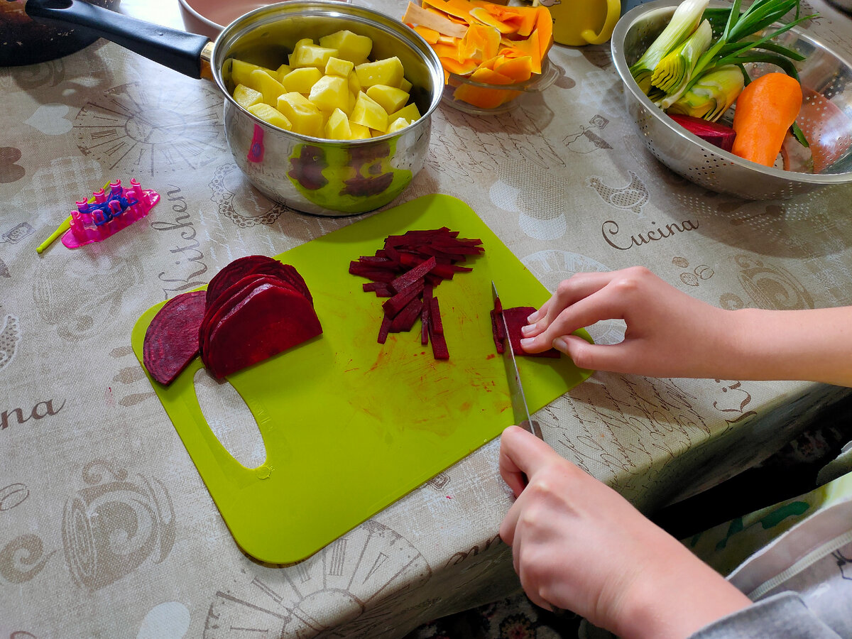 Начну с того, что Рада на этой неделе в понедельник и вторник осталась дома. Она чувствовала слабость и немного была на нервах. Я решила, что уроки всё равно не пойдут и отпросила её. А Рада решила, что хочет сама приготовить борщ. И приготовила:) Ну конечно немного с помощью:)