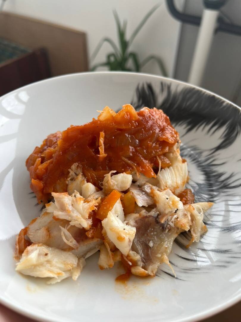 Очень люблю это блюдо!! И быстро и вкусно, для холодной закуски, ооочень подойдёт))))). Ингредиенты: рыбы белой (у меня замороженные стейки трески), средних морковки, луковицы, томатной пасты, молотый перец , сухой чеснок, соль, оливковое масло (для жарки) Способ приготовления: Сначала, размороженную рыбу натираем солью, перцем и сухим чесноком(можно использовать рыбную приправу), заворачиваем в фольгу, как лодочки. И в разогретую духовку на 30-35 минут на 190 градусов. Натираем на крупной терке морковку. Лук репчатый мелко режем. Обжариваем на оливковом масле, добавляем томатную пасту(для меня самая вкусная Иранская), разбавляем водой чтобы прикрывало зажарку, и выпариваем лишнюю влагу. Так наша заварка пропитается томатом. Перец молотый и чеснок сушеный добавляем в конце. Как рыба готова, остужаем до комнатной температуры, чтобы можно было не перебрать на маленькие кусочки. Так же остужаемся зажарку. Дальше берём контейнер, в который будем все выкладывать. И я делаю в два слоя, может
