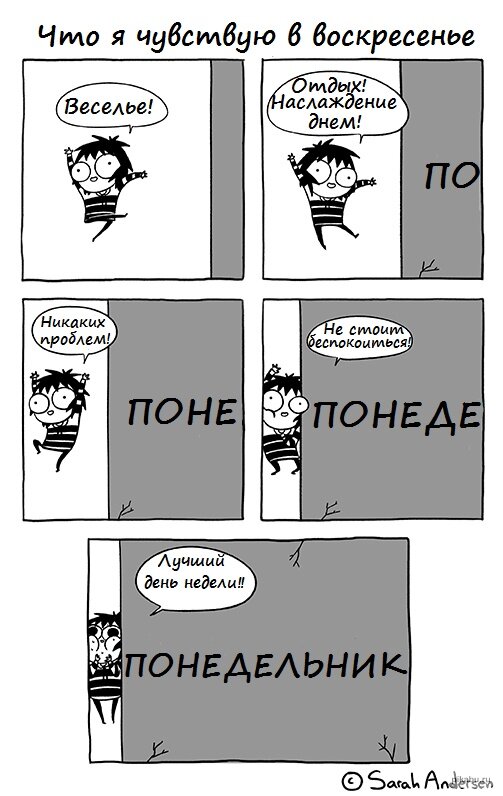 Привет, дорогой друг! Я не из тех людей, кто в коллективе обычно нагоняет панику или суетится раньше времени, но сегодня мне придется выступить именно в такой роли. В чем же дело? Все просто — сегодня понедельник, и до начала выходных еще 5 дней. Чтобы скрасить сложный первый рабочий день, я собрал #комиксы от разных авторов, которые посвящены понедельнику. Естественно, эта подборка нужна не для того, чтобы напугать неизбежным, а подбодрить, ведь #юмор — это отличное лекарство от стресса. Начнем с комикса от Сары Андерсен, которая заметила, что для некоторых наступление понедельника очень серьезный #стресс . Настолько серьезный, что ожидание этого трудного дня портит все воскресенье. В комиксах следующего американского художника из Чикаго Райана Пэйджлау всегда минимальное количество слов (по большей части автор обходится вовсе без них). Однако, ему невероятно точно удается передать эмоциональную палитру, которую проживает человек, пытаясь отдохнуть на полную катушку в последний выходн