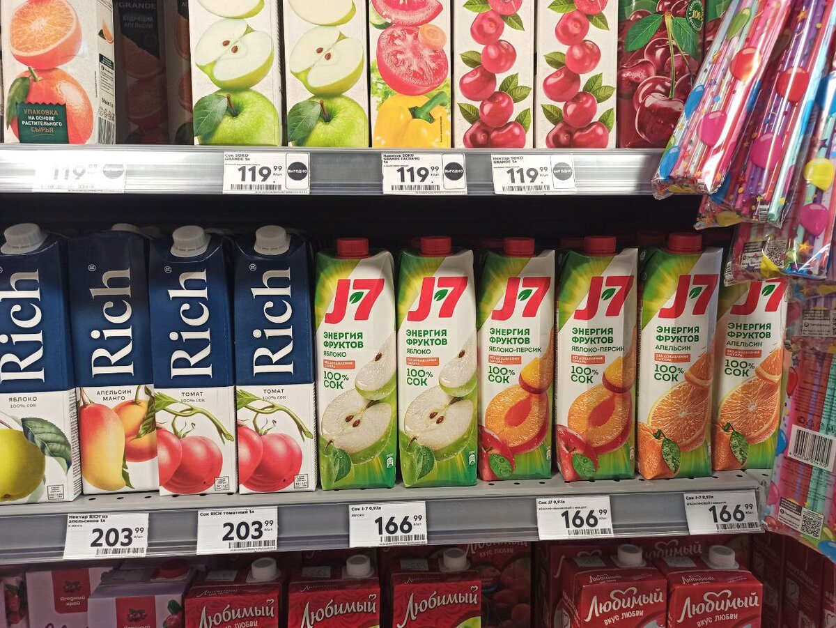 Ну что ж, поехали. Буду писать коротко и под конец просто выражу свое собственное мнение. Начнем с более дорогих соков, это J7 и Rich. Цены вы видите на фотографии. Сразу скажу, это дорого! Ну они не стоят таких денег, в связи с санкциями они еще подлетели. Да, на вкус они очень даже здравые, хорошая упаковка, густой сок с мякотью. Эти соки сразу встают на первое место. Но не забываем тот факт, что покупной сок - это не есть хорошо!