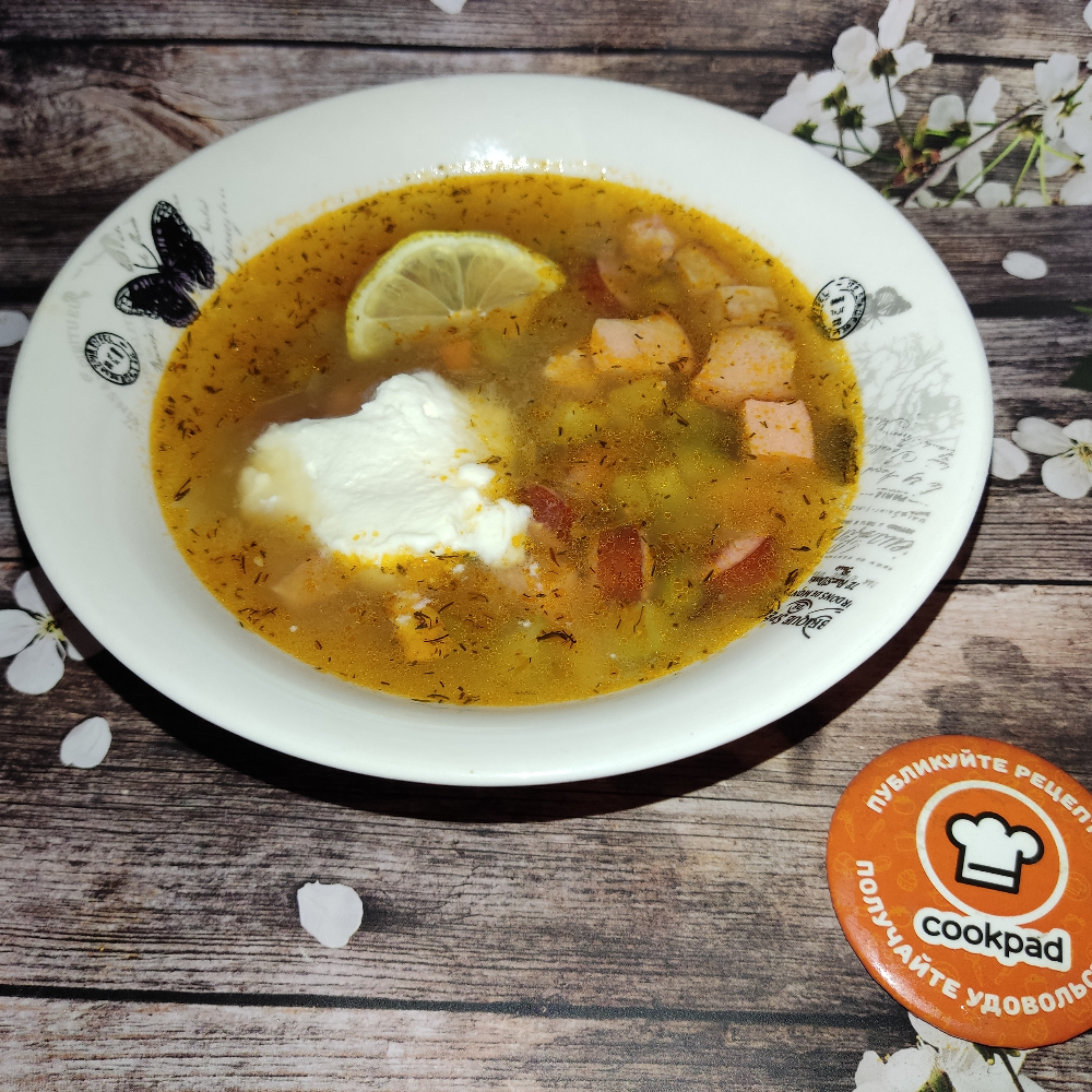 Ингредиенты: Мясопродукты (копченые колбаски, колбасы, грудинка и т.д.), Картофель, Морковь, Лук репчатый, Огурцы корнишоны, Паста томатная, Масло подсолнечное, Соль, Перец черный молотый, Маслины по желанию, Зелень, Лимон, Сметана, Вода Способ приготовления: Ставим воду, чистим, моем и нарезаем картофель произвольно у меня кубиком. Нарезаем произвольно (у меня кубиком) мясопродукты, очищенные лук и морковь, корнишоны. Закладываем картофель в кипящую воду. Овощи пассеруем, мясопродукты обжариваем на отдельной сковороде на капле масла. Соединить пассеровку и мясопродукты, добавляем томат и вливаем 2-3 половника бульона. Тушим 5 мин. Закладываем в кастрюлю к картофелю. даём повариться мин 10, солим и перчим по вкусу. При подаче добавить маслины, лимон, сметану и зелень. Приятного аппетита!!