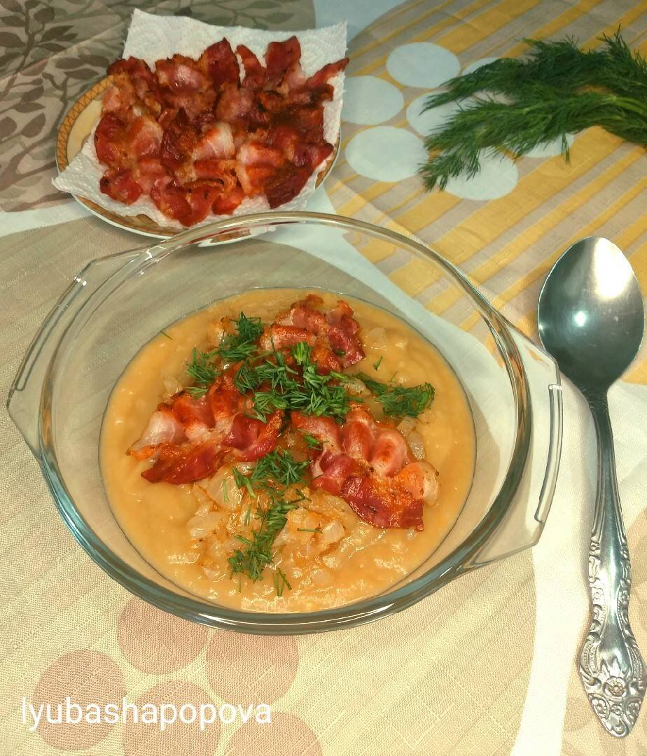 #меню #гороховаякаша Гороховая каша - многонациональное блюдо, которое может использоваться как самостоятельно, так и в качестве гарнира к рыбе или к мясу. Я приготовила гороховое пюре с обжаренным луком и беконом. Ингредиенты: колотого жёлтого гороха, воды, соли, сливочного масла, сырокопчёного бекона, луковица, свежий укроп Способ приготовления: Горох предварительно замочить на 4 часа. Если его не замачивать, то время готовки увеличится. Промыть и переложить в чашу мультиварки. Залить водой, посолить и поставить мультиварку на режим "Тушение" на 1,5 часа. Как только горох полностью разварится положить кусочек сливочного масла и дать потомиться в режиме подогрева 10 минут. Сырокопчёный бекон промыть под водой 2-3 минуты. Выложить на бумажное полотенце и хорошо обсушить. Разогреть сковороду и выложить полоски бекона. В процессе обжаривания необходимо постоянно переворачивать кусочки мяса, чтобы они подрумянивались равномерно. Когда кусочки мяса приобретут тёмно-коричневый оттенок, беко