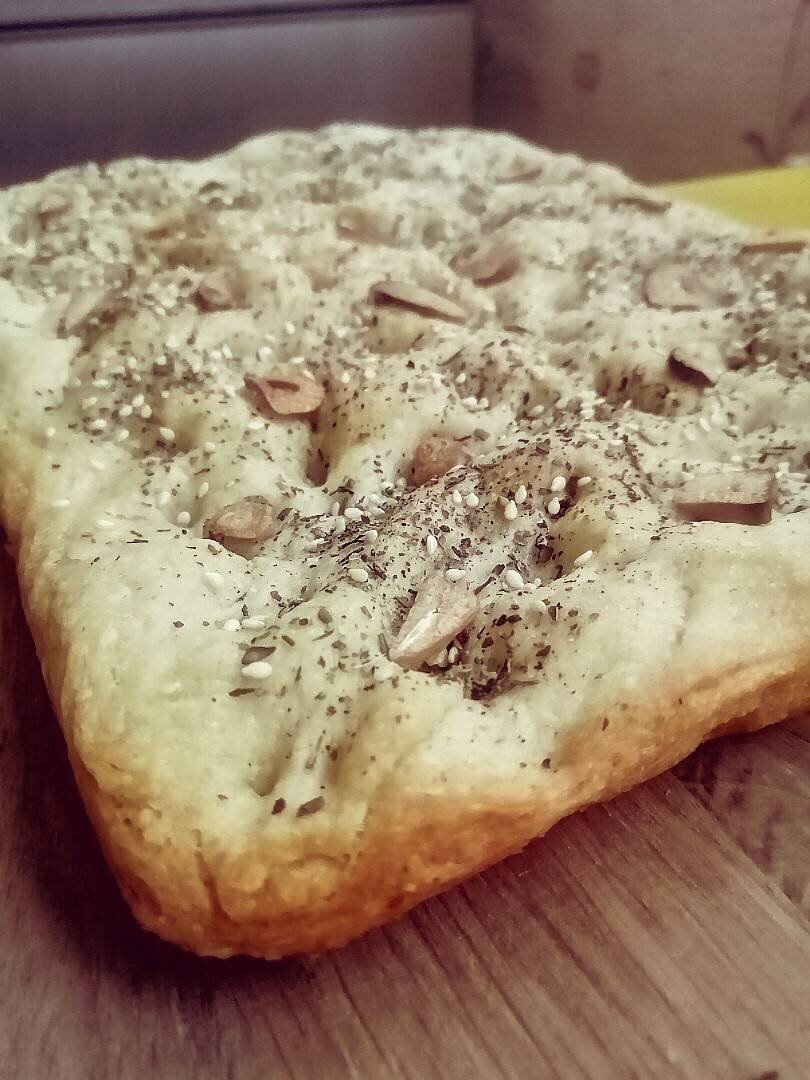 Ингредиенты: муки, воды, соли, дрожжей, оливковое масло , заатар, чеснока Способ приготовления: Сначала проверяю живы ли сухие дрожжи: растворяю их в небольшом количестве теплой воды и засыпаю щепотку сахара, перемешиваю и жду минут 10, должны немного вспениться. Готовим тесто как на хлеб: в муку добавляем соль, дрожжи, пару столовых ложек оливкового масла и заливаем воду постепенно, может потребоваться или чуть меньше, или чуть больше. Замешиваем тесто, оно не должно липнуть к рукам, должно остаться мягким. Минут 5-10 хорошо разминаем. Миску смазываем маслом и оставляем тесто на 1.5-2 ч подняться в два раза. В поддон для выпекания заливаем тонким слоем оливковое масло, тесто перекладываем в него, немного стараемся растянуть по форме, но не сильно, не выбиваем воздух и объём. Накрываем и даём ещё около 30 минут немного подняться. Духовку разогреваем до 180-200 гр. Тесто аккуратными нажатиями распределяем до краёв, посередине делаем везде вмятины. Поливаем оливковым маслом, посыпаем заа