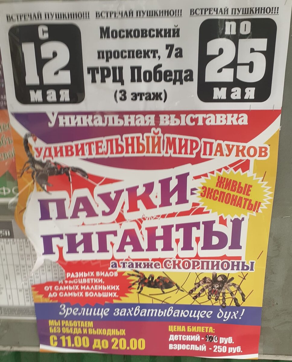 Здравствуйте! Сегодня я расскажу о контактном зоопарке с пауками! Как я боюсь мух, жуков, гусениц и прочую "нечисть из семейства насекомые", боязнь такая с детства. А вот сын ... он их любит, ему не нужно ни кошки, ни собаки, в качестве домашних животных признаем пауков и жуков, но надеюсь до коллекционирования данных экземпляров не дойдет. И тут афиша: " приглашаем посмотреть на пауков" и как это мы не пойдем, это как кошек погладить или голубей покормить! Билеты были не дорогие. Субботний день.... Сколько же тут было пауков, шла я и думала "как хорошо, что "эти" не у нас в МО живут...а то так проснешься, а он у тебя на столе...из тарелки крошки собирает" , но тут не страшно, они же за "стёклышком". 🤷♀️ Но увы и ах! Он оказался контактным, доставали пауков, скорпионов, давали в руки, как же было страшно, это за "стёклышком" они милые, а когда на руке, очень даже нет. Но детвора радовалась и без страха брала в руки., а кто боялся...того заставляли, держали руку Ну вот и закончил
