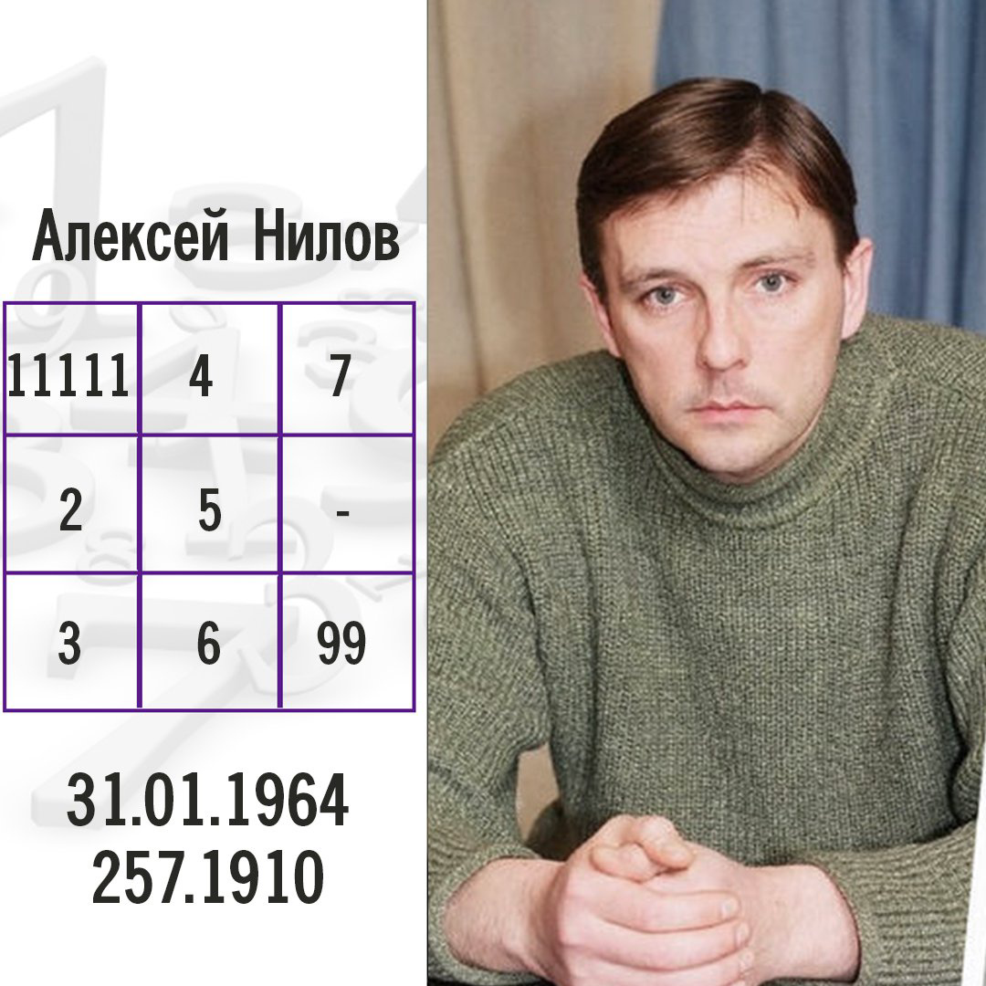 «28 браков!», - именно столько пишут было браков у Алексея Нилова, актера из «Улицы разбитых фонарей». Честно вам скажу: я осталась под впечатлением от прочитанного, заинтересовалась его биографией и решила, что перед нами интересная личность для разбора. Стала читать я его биографию и запуталась, так как везде пишут по-разному. Но а мы с вами верим цифрам. Его дата рождения: 31.01.1964 257.1910 Одним словом, непростая личность перед нами. А я предлагаю перейти к обсуждению его личности в комментарии. Делитесь, что вы видите в его показателях?