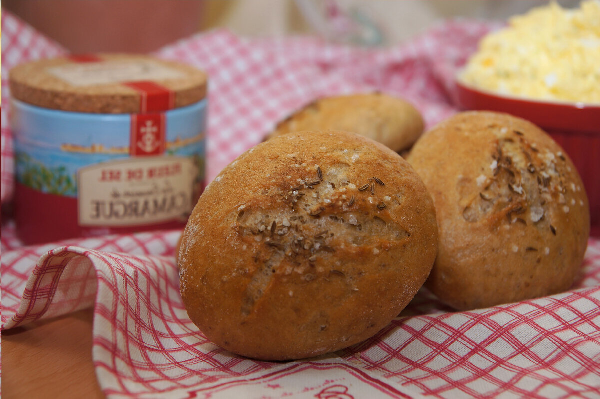 Я делаю рогалики на закваске довольно регулярно, но так как закваска есть не у всех, в этот раз я хотела попробовать сделать рогалики из обычных дрожжей. Если не считать того, что в следующий раз я посыплю сверху больше семян тмина и соли, я бы не стал их ругать, так что если вы хотите их попробовать, вот рецепт. 🙂 Ингредиенты (примерно 10 штук): 150 г ржаной муки 350 г обычной пшеничной муки 13 мл уксуса 3 г семян тмина 4 г хлебных специй (кумин, анис, фенхель) 1/2 пакетика сухих дрожжей (или половина кубика) 330 мл теплой воды 10 г соли для распространения: ржаная мука крупная соль (я использовал камаргскую соль), кумин для посыпки Поместите ингредиенты в чашу кухонного комбайна и используйте насадку крюк, чтобы комбайн работал над тестом (на самой низкой скорости). Оно должно оставаться немного липким, но при этом иметь компактную и гладкую форму. Если тесто сильно прилипает, добавьте немного муки. Разделите тесто на 10 частей примерно по 80 г каждая. На посыпанной мукой рабочей