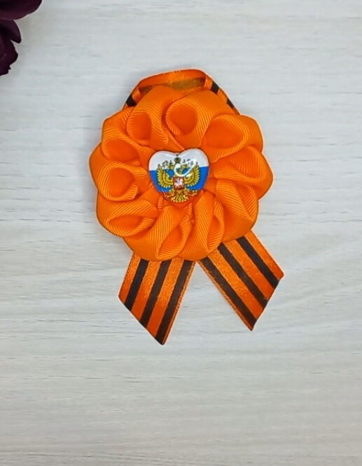 Для работы нам потребуется: На фото 1 показано, что нужно для изготовления основы броши на 9 мая. Возьмем атласную георгиевскую ленту шириной 2,5см длиной 27см. Можно взять и репсовую или жакардовую, главное, чтобы лента была с георгиевской раскраской. На фото 2 мы складываем ленту пополам, нам нужно найти ее центр. Для лучшей видимости используем булавку. Сложим ленту как показано на фото 3. Нужно следить чтобы хвостики по длине были одинаковыми. Закрепим клеем, для этого отогнем верхний слой ленты и под него нанесем немного клея. Заготовку для броши отложим пока в сторону, возьмем репсовую ленту 3,8 см в ширину и отрежем 10 отрезков по 8 см, в моем случае это оранжевый цвет ленты . Отрезок 8 см сгибаем пополам. Нужно найти центр для дальнейшей работы. Разворачиваем отрезок и теперь сгибаем вдоль как показано на фото 6, нужно что бы все было ровненько. Подпалим зажигалкой как показано на фото 7. Это нужно для того, чтобы лента не двигалась при дальнейшей работе. Брем в руки отрезок ле