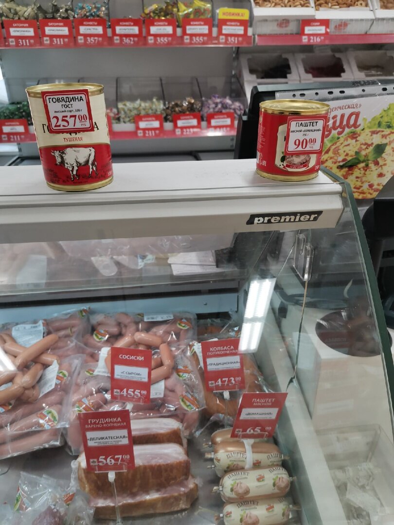 Захотелось мне сегодня вновь поговорить о ценах, но, выбрав для обзора "Ермолино", я решила не зацикливаться на полуфабрикатах, а оценить ассортимент в целом. Тем более, что сейчас это интересно вдвойне, так как везде цены стали ползти вверх, причем порой довольно быстро, что аж многие покупатели стали искать альтернативу некогда своим любимым магазинам. "Ермолино" же пользуется обычно хорошим спросом, но сейчас я вижу, что людей стало заметно меньше, а многие мои читатели с недовольством отмечали тот факт, что цены и вправду поменялись, причем не в лучшую сторону. Да что уж скрывать, я и сама отметила скачок у некоторых продуктов аж рублей на 40-60, но и при такой стоимости магазин остается бюджетным в вопросе покупок некоторых товаров. Что же, какие нынче цены нас там ждут, давайте разбираться вместе: Я не воспринимаю тушенку совершенно, хотя родители иногда приобретают ее, чтобы приготовить один из быстрых ужинов - макароны да тушенка, вот и весь набор продуктов, но именно "ермолинс