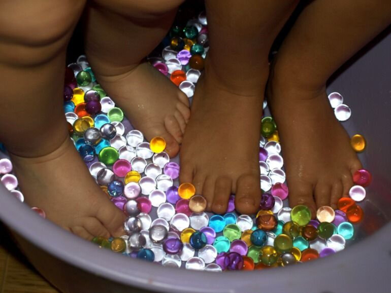 Последнее время стали популярными гидрогелевые шарики. Конечно, они предназначены для выращивания цветов. Но многие мамочки находят им применение в развивающих играх с детьми. Ведь это новые тактильные ощущения для ребенка и много приятных эмоций! Где найти гидрогелевые шарики? Они есть практически в любом цветочном магазине. Маленькие твердые гранулы продаются в небольших пакетиках. Вариантов цветов масса, есть даже разноцветные в одной упаковке. Чтобы играть с ними, залейте эти шарики водой. Детям будет очень интересно наблюдать за процессом роста шариков. Когда шарики станут большими, с ними можно играть. Ребенку понравится трогать их ручками, перебирать, закапывать ручки в них. Шарики скользкие и интересные на ощупь. Предложите малышу ложкой перекладывать шарики из одной емкости в другую. Эти шарики хорошо прыгают и укатываются от малыша. Сколько восторга было просто догонять их. Попробуйте подуть на горошинки — своеобразный футбол вам обеспечен. И отличная дыхательная трени
