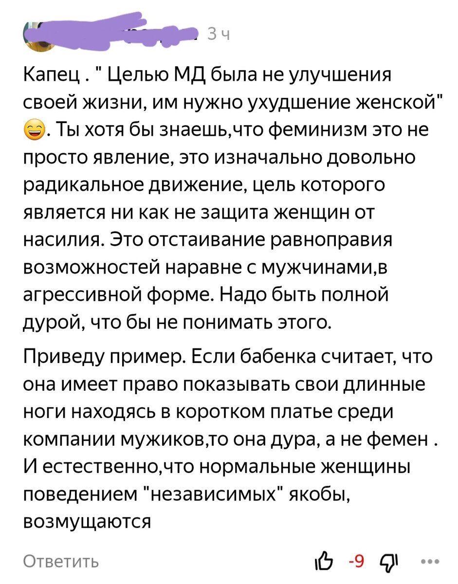 Добрый день, мои дорогие читательницы и читатели. Несколько дней назад, я пообещала одному комментатору посветить статью. Речь пойдёт о женском виде и как мужчины демонизируют сами себя. Открытым текстом говорят: "Остерегайтесь нас, не ждите ничего хорошего." Если женщина надела мини-юбку, то она не далёкого ума. Почему? Ну потому-что будет провоцировать своим видом бедных мужчин, которые не в силах контролировать себя. Женщин заставляют стыдиться себя, заставляют скрывать себя, свое тело. Иначе это будут расценивать "сама захотела", "сама виновата". Вот ещё одни экземпляр: Нет, это не безмозглость, как тебе кажется. Это значит, что даже если женщина решила пройтись голой по улице, максимум на что она может нарваться это быть привлечённой к административной ответственности за мелкое хулиганство. Но, ни один человек не имеет права касаться её пальцем. Когда я вижу мужчину с голым торсом, почему-то у меня не возникает мысли: "Провоцирует, негодник. Завлекает". Почему я понимаю, что личн