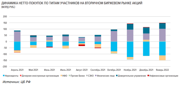 На конец I полугодия 2021 г. нерезиденты владели около 80% free-float российского рынка акций. Во II полугодии 2021 г. они в большей степени выступали продавцами российских акций: совокупные продажи с июля 2021 г. по январь 2022 г. могли превысить 450 млрд руб. Пока нет данных, какие объемы продаж были в феврале, но, вероятнее всего, они были выше уровней последних месяцев. Больше финансовых новостей и сводок в нашем Telegram ✌ В результате можно предположить, что доля нерезидентов во free-float с 80% на конец I полугодия 2021 г. снизилась к концу февраля 2022 г. до 60–70%. Если ориентироваться на отмеченные выше 13,7 трлн руб. совок