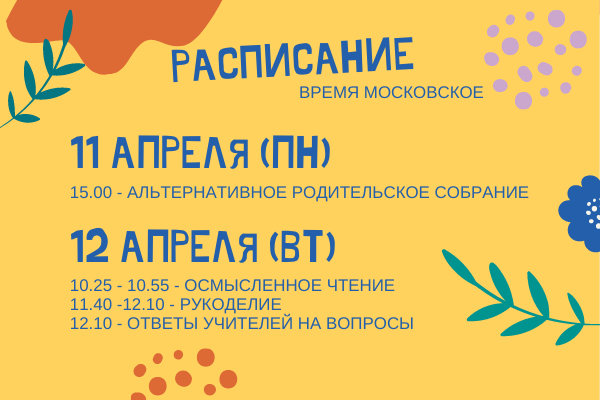 Уже завтра 12 апреля (вторник) пройдут первые открытые занятия у детей 5-7 лет (дошкольники): 10.25 - 10.55 - Осмысленное чтение 11.40 -12.10 - Рукоделие 12.10 - ответы учителей на вопросы, возникшие у родителей по ходу занятий. Чтобы получить ссылки на трансляции альтернативных занятий и собраний, пожалуйста, заполните короткую регистрационную форму: https://forms.gle/L8xyqeRCRdBPZovw6 Ссылки на трансляции будут персональными. Без них невозможно будет присоединиться.