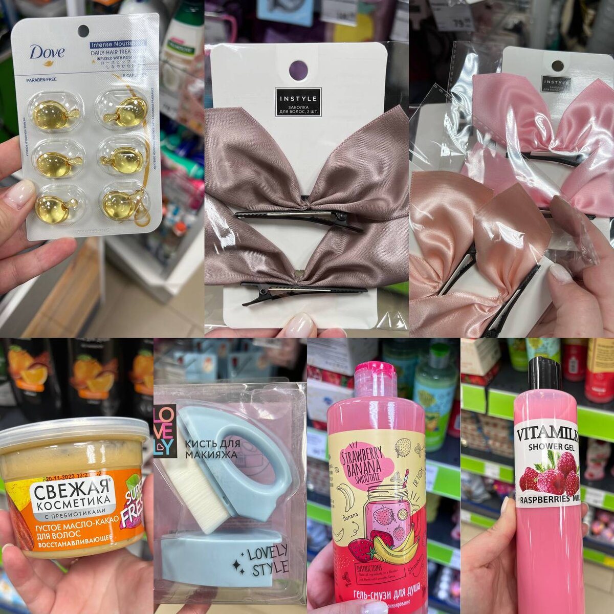 1. Масло для волос от бренда «Dove» Масла внутри ампулы оказалось достаточно много. Аромат довольно-таки приятный. Очень удобно брать такое масло в поездку, оно не занимает много места. Ампулу оказалось проблематично раздавить, но, например, в поездке это окажется даже плюсом, с уверенностью можно положить в косметичку, не переживая что ампула раздавится и масло вытечет. Волосы после применения мягкие и рассыпчатые. Рекомендую. Стоимость: 99 рублей. 2. Заколки для волос от бренда «InStyle» Очень милые бантики, представленные в нескольких цветах. Мне понравилось качество этих заколок, хорошо фиксируются на волосах, бант приклеен качественно. Давно искала подобные заколки, не задумываясь приобрела. Рекомендую. Стоимость: 59 рублей. 3. Густое масло-какао для волос Интересный формат упаковки, напоминает консервную банку. Хорошее масло, которое придаёт блеск волосам. Аромат сладкий, с нотками сливочного кофе и шоколада. Состав масла натуральный. Рекомендую попробовать, но не возлагать боль