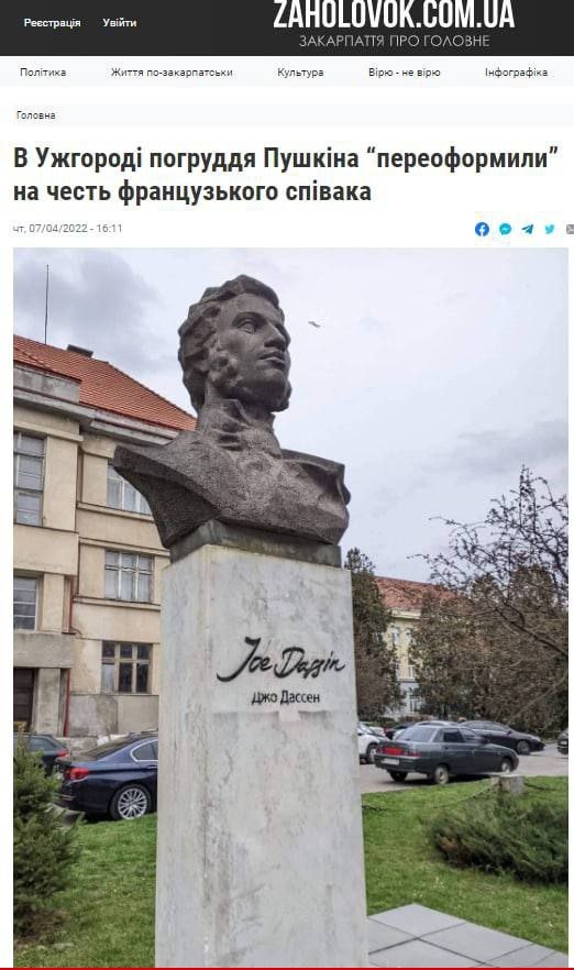 Его всё равно снесли. Не смотря на маскировку. Не повезло Ленину. Опять. Для меня загадка. Почему Пушкин? За що? Война с памятниками. Бессмысленная и беспощадная. "Хохол с натуги ворот рвет, За ляхом тянется к европам, Спеша за шнапс и бутерброд Служить в неметчине холопом. И мир вокруг по швам трещит, И шрамы набухают кровью, А мы как прежде держим щит Пустому вопреки злословью." (Владимир Веров 2004 г) Пушкину бы понравилось стихотворение, которое ему приписывают
