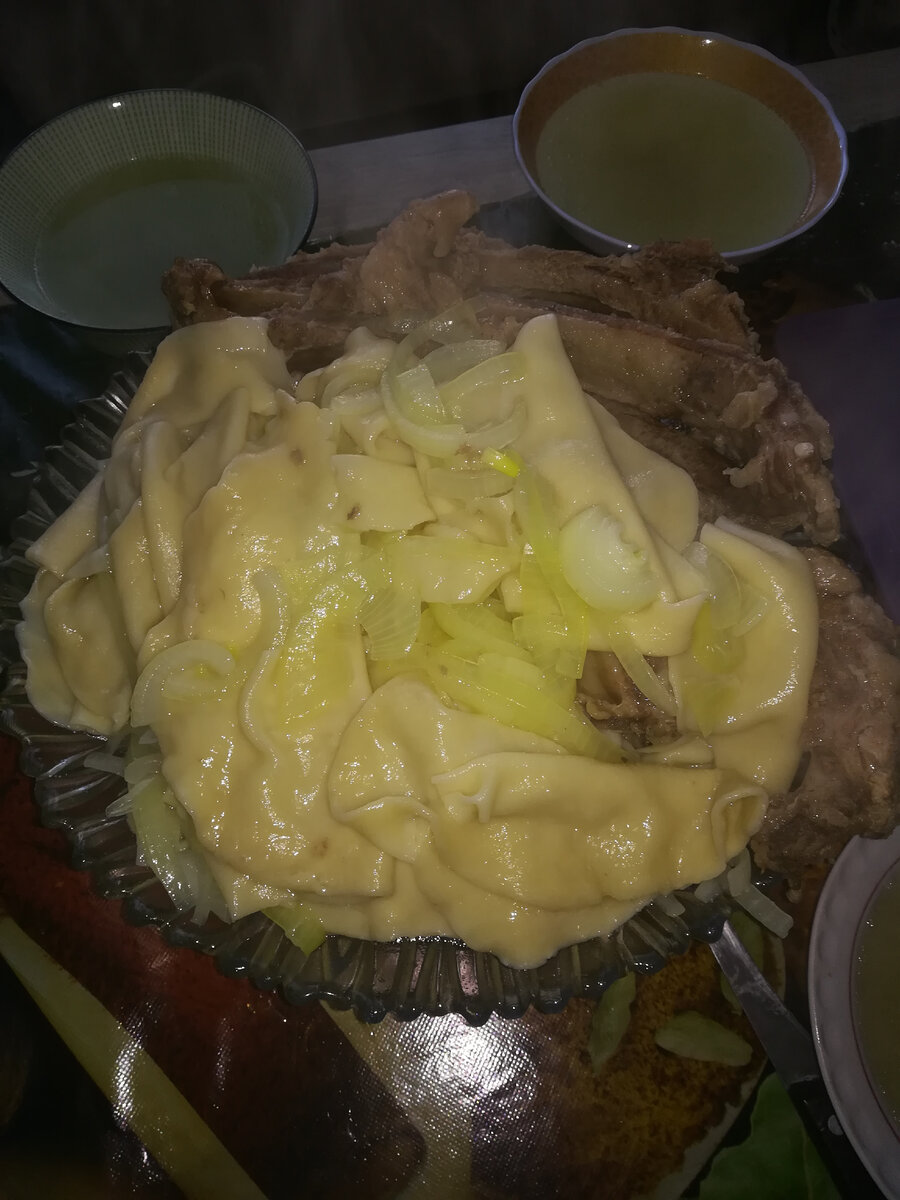 Сегодня на ужин у нас традиционное блюдо казахов-бесбармак. Правда готовим мы его на русский манер. Мясо берём то, которое в данный момент есть в наличии. Сегодня ребра. Сочни готовим на бульоне в котором варили ребра. У нас имеется хлебопеч она очень вручает в замешивании теста для сочней. И конечно же много лука. Очень любим данное блюдо оно заменяет и первое и второе. Для приготовления данного блюда в магазине мы купили только 2 стакана муки.