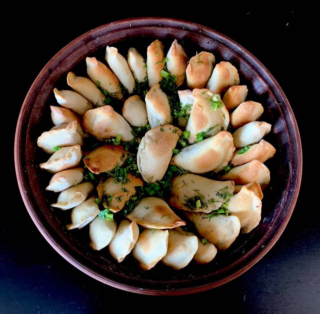 Ингредиенты: Для теста:, Мука, Кипяток, Соль, Растительное масло, Начинка:, Гречка, Сушёные лесные грибы , Лук, Соль, Для подачи:, Свежая зелень, Сметана