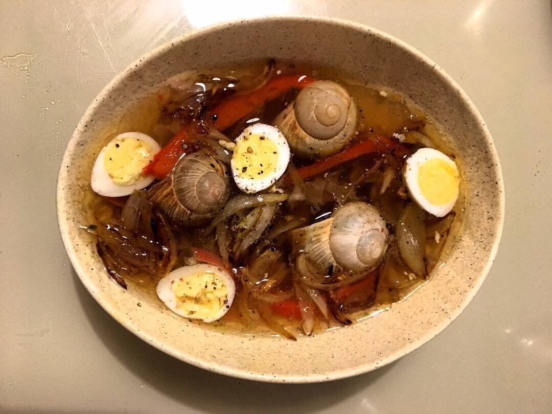 Ингредиенты: говяжьего бульона, небольшие луковицы, замороженных улитки, сухих китайских грибов, перепелиных яйца, маринованный имбирь , маринованный перец, соль, свежесмолотый перец
