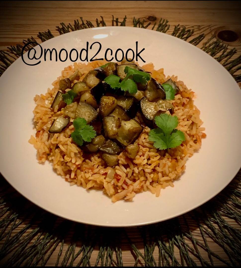 Ингредиенты: Лук репчатый, Рис длиннозерный (басмати), Растительное масло , Сушеный абрикос (курага), Баклажан, Томаты конкассе, Овощной бульон, Вода, Корица на кончике ножа, Кумин , Соль перец
