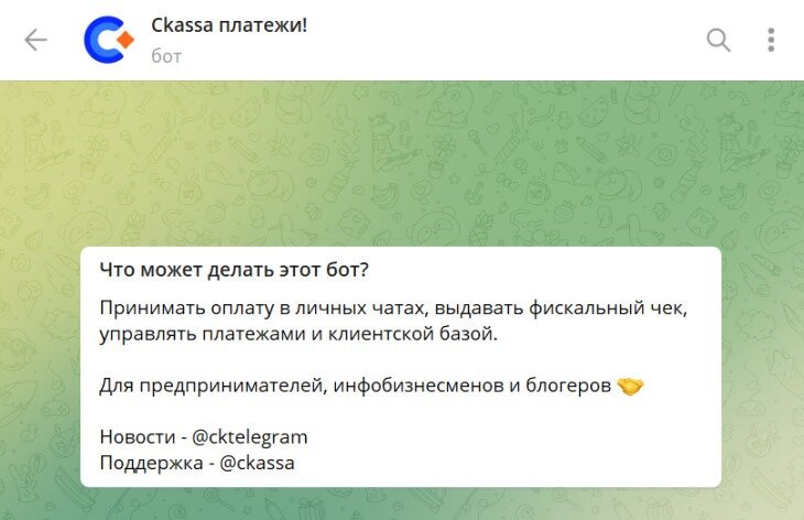 Финтех-компания Ckassa в марте запустила в Telegram платежного бота нового поколения - @ckpaybot. Он позволяет принимать оплату в личных чатах с клиентами, управлять платежами, клиентской базой и легко настраивается пользователем без программирования. Платежный бот должен помочь предпринимателям, которые переносят в Telegram бизнес и продажи из заблокированных соцсетей. Первыми пользователями бота стали инфобизнесмены, блогеры, продавцы услуг и консультанты. Возможность создания платежных ботов доступна в Telegram уже несколько лет. Но для их подключения пользователям приходилось серьезно заниматься настройкой или программированием. Бот Ckassa позволяет подключить платежи за несколько минут, отправлять клиенту платежные ссылки, QR-коды, предоставлять чеки, принимать платежи с дебетовых, кредитных карт и через СБП. Если продавец не на связи, то бот поможет покупателю найти услугу и выставит счет для оплаты. «Существующие платежные боты в Telegram очень часто не принадлежат платежным сис