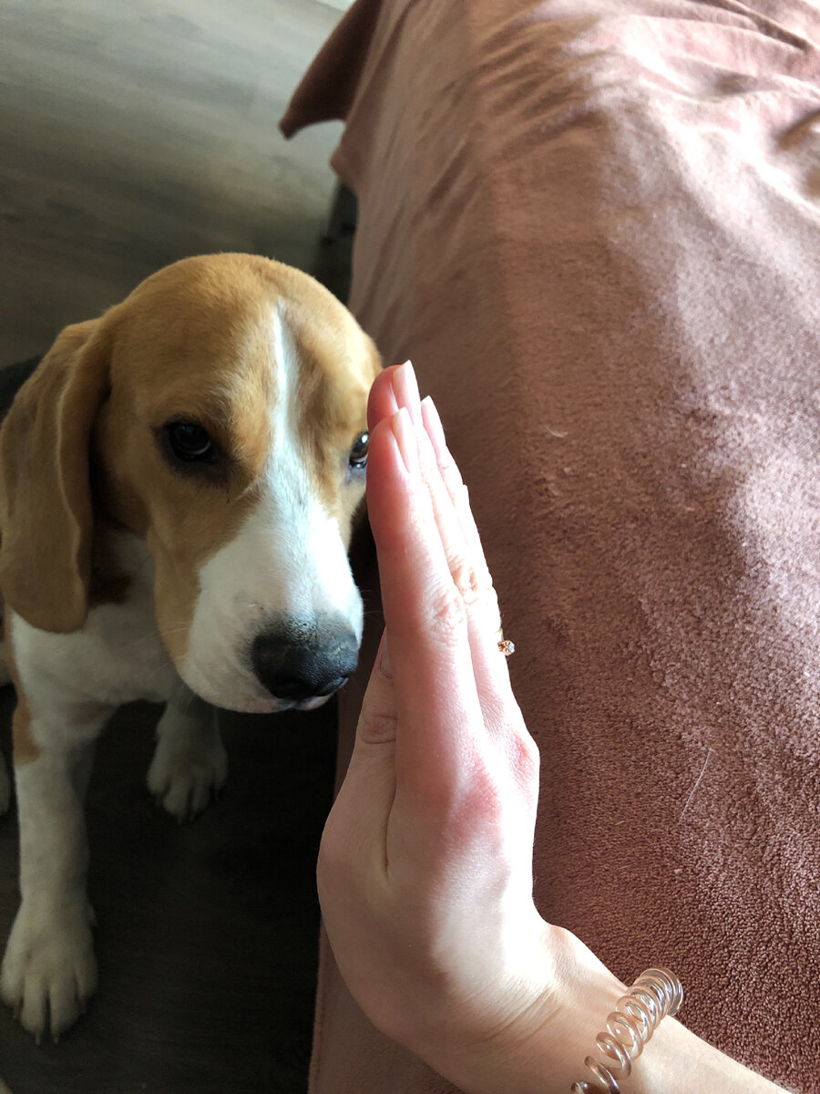 Мы с нашим биглем начали заниматься с кинологом. Именно она показала нам как правильно приучать животное к командам. Начали мы с команды «сидеть». Эта команда даётся проще всего, потому что собаки сами по себе любят садиться, особенно щенки. Для освоения команды нам понадобилась еда или лакомства. Кто-то занимается с собакой, используя лакомства. Мы решили использовать еду, потому что больше кусочков, за которые питомец готов работать. Вообще, наш пёс имеет больше игровую мотивацию, нежели пищевую. Из еды ему нравится только что-то натуральное, мясное. Но если есть выбор между игрушкой или едой, то, конечно же, это будет игрушка. Чтобы щенок сел, нужно поставить руку с кусочком вертикально и поднести к носику с командой «сидеть». Наглядно это так: Собаке нужно 150 повторений, чтобы это отложилось. Ни в коем случае нельзя ругать за невыполнение команды. Вообще, нужно понимать, если собачка устала и не хочет больше заниматься. В таком случае мы просто отпускаем питомца. В следующих