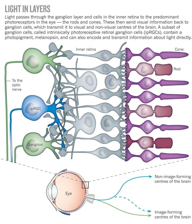 Кратко: помимо основных широко известных фоторецепторов — палочек и колбочек — в сетчатке есть третий тип воспринимающих свет клеток: собственно, меланопсинчики, или ipRGCs. Основные их функции — адаптация к свету и темноте, обеспечение рефлекторных движений зрачка и регуляция циркадных ритмов. Здарова всем сетчаточным и свято убежденным, что видим мы только за счет палочек и колбочек! Наступило великое время отбросить догмы из учебника биологии за 8 класс и утереть нос ограниченному пониманию фоторецепторов! Ибо еще с 1991 года началось наблюдение за особым слоем ганглиозных клеток сетчатки — меланопсинсодержащих. Они имеют уйму связей с остальными нейронами, гипоталамусом, шишковидной железой etc., юзают собственный зрительный пигмент (а не пресловутые родопсин и йодопсин) и возбуждены 24/7. А еще, возможно, они — самые древние фоторецепторы сетчатки. Для введения в курс дела — три абзаца про сетчатку и собственно фоторецепторы. Посвященным — дорога дальше. Основа зрения — механизм п