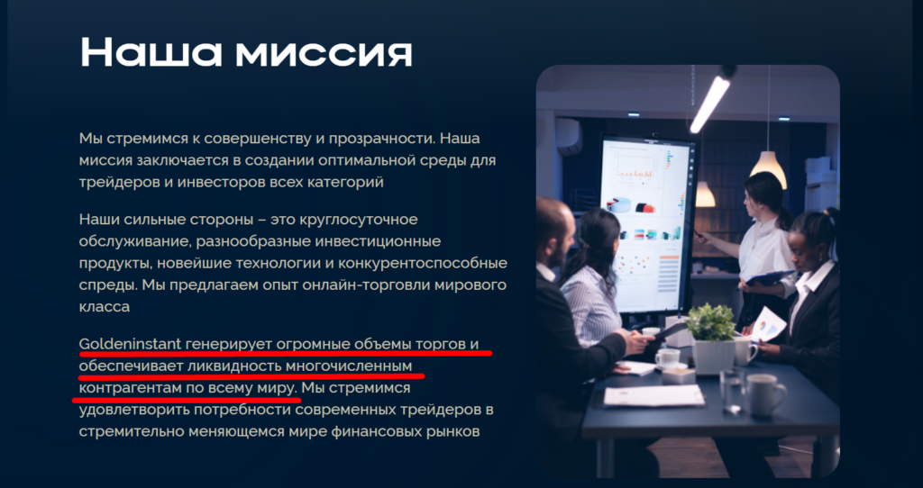 При первом посещении мошеннического ресурса первое, что бросается в глаза это их слова - «Компания Goldeninstant генерирует огромные объемы торгов и обеспечивает ликвидность многочисленным контрагентам по вceму миру. Мы стремимся удовлетворить потребности современных трейдеров в стремительно меняющемся мире финансовых рынков»