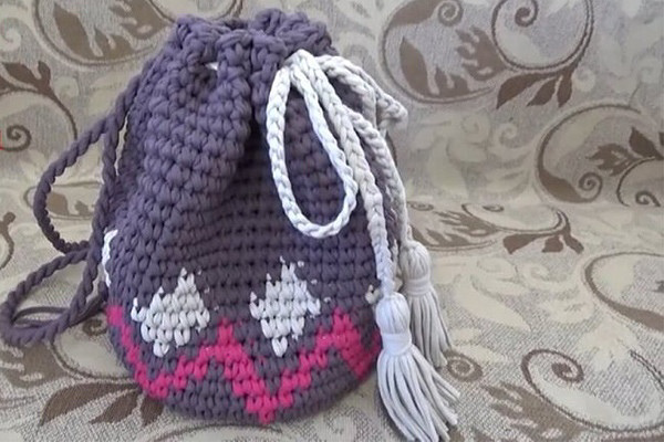 Связать рюкзак крючком из ленточной пряжи — пошагово с фото Ленточная, или трикотажная пряжа — это трикотаж, порезанный на полоски, и скрученный к центру. Из этой пряжи вяжут красивые сумки, рюкзаки, тапочки, пуфики, корзинки, коврики, и многое другое. Предлагаем вам связать рюкзак крючком из трикотажной пряжи типа Spagetti, мастер-класс прилагается Для работы понадобится: Пряжа типа “Лента” — 2 бобины по 100 метров коричневого цвета, 1 бобина 50 м. малинового цвета, 30 м. цвета беж. Крючок толщиной 8 мм. Полукольца — 3 штуки. Булавка для обозначения начала ряда. Основной узор для рюкзака из трикотажной пряжи — столбики без накида. Обозначения: СБН — столбик без накида, СП — соединительная петля, ПП — петля подъёма, ВП — возд. петля. Делаем петлю амигуруми, в кольцо провязать 4 СБН, и стянуть. 1-й ряд: В 1-ю петлю, провязанную из кольца, вставить крючок и провязать СП. Затем делаем ПП, и в каждый столбик предыдущего ряда вяжем по 2 СБН вместе. Итого — у нас получилось 8 СБН. 2-ой ряд: