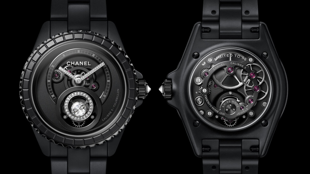 Друзья! Компания Chanel – далеко не первый бренд, который приходит на ум, если вы интересуетесь новинками швейцарской часовой отрасли. И все же 35 лет часового производства – это немало. За это время Chanel не раз доказывала, что умеет удивлять своими часами. Мы собрали для вас самые интересные новинки, которые компания представляла на недавно прошедшем часовом салоне Watches& Wonders2022. Chanel J12 Tourbillon Diamant Внешне эти часы цепляют бриллиантом весом 0,18 карат, установленным прямо на каретку парящего турбийона. Что касается «начинки», в этой модели дебютировал первый собственный калибр Chanel с парящим турбийоном. Механизм с лаконичным названием Калибр 5 был разработан директором часового направления Chanel Арно Шастеном. Заводить часы нужно вручную. Запаса хода хватает на 42 часа. Новинка представлена двумя версиями – по 55 экземпляров каждая. Первая получила 38-миллиметровый корпус и браслет из матовой черной керамики и стальной безель с матовой керамической вставкой. Орие