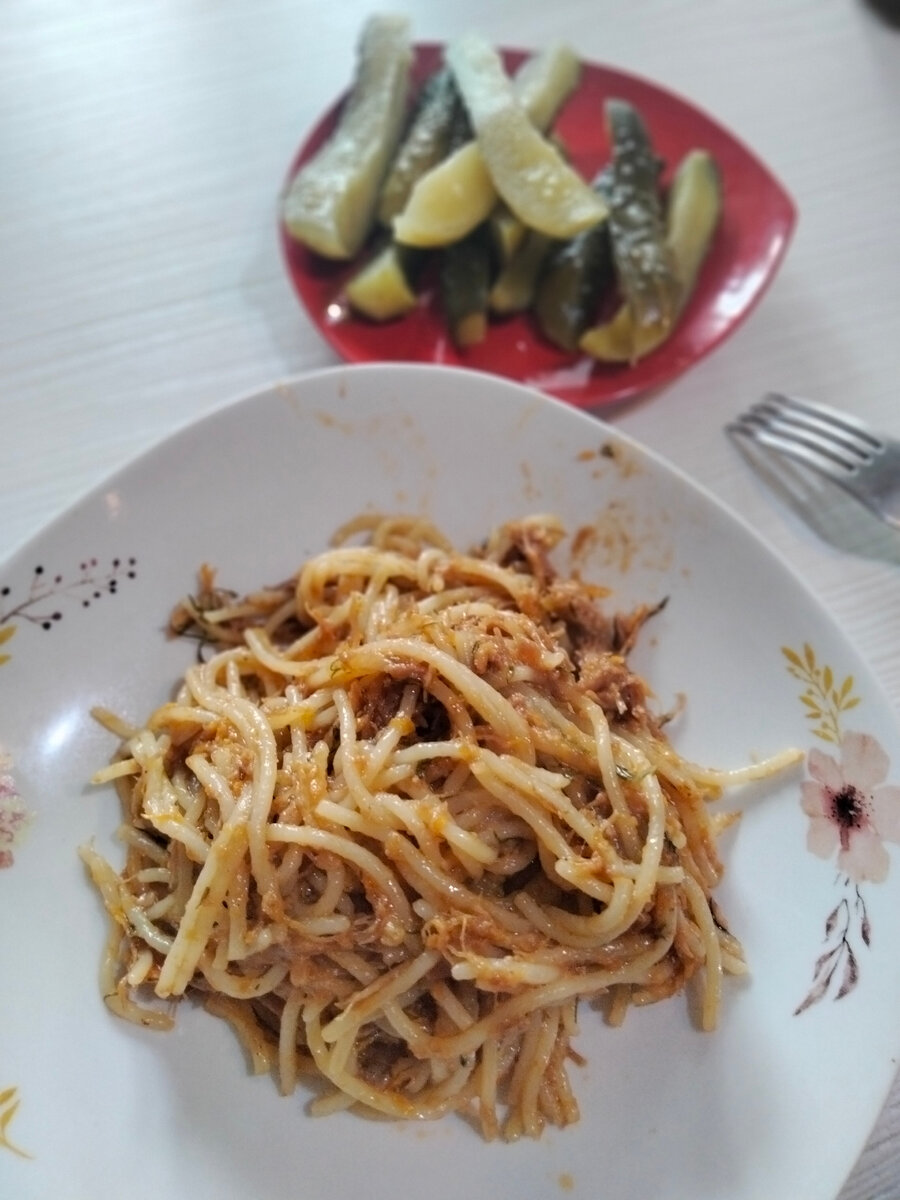 Здравствуйте! Что тут скажешь. Чтобы это явление увидел мир, должны по-особому сложиться обстоятельства. Это выходной на работе у мужа, его настроение, мое ненастроение и так далее. Именно в этом случае он героически встает у плиты, вдохновенно смешивает все подряд, горячо уверяя меня, что ТАК, готовит только он. Коронное-прекоронное блюдо - тушенка с макароны. Вот только если обычный человек просто смешает то и другое, то муж мой добавляет еще кучу всего, по своей методике. Не могу удержаться от сарказма) В общем, в сковороде разогревается тушенка, отдельно жарится лук, морковь, в какой-то момент добавляется чеснок, зелень, приправы, томатная паста и что-то еще. Как секретный ингредиент крабсбургера) Потом в эту смесь отправляются сваренные уже макароны, все перемешивается, раскладывается по тарелкам и с апломбом подается. На этот раз были спагетти и тушенка "Село зеленое". Всего остального не знаю, но выходит у него это дело обычно вкусно. А я что, я второй день почти не готовлю, а у