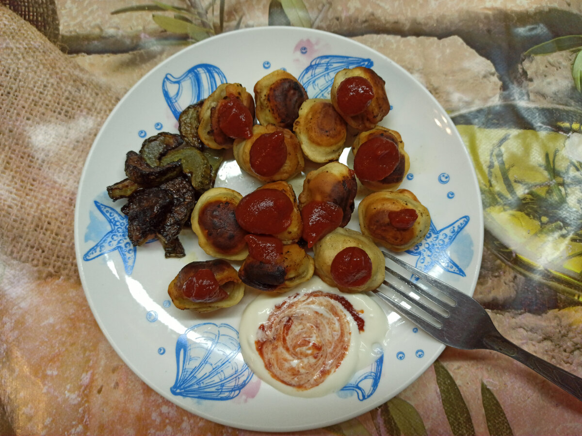 Добрый вечер! Сегодня Олег меня решил удивить! Сказал лежать и наслаждаться его заботой! Он вызвался приготовить ужин. Как в ресторане подошёл ко мне и склонил головку ниже бровей. Поинтересовался- что я желаю по меню. В его меню были толька пельмени! Это было не честно! Их любой отварить может. Даже филерук! Попросила пельмени жареные. И огурчик. Олежка сделал лицо овалом и отчалил на кухню. Не было его очень долго! Мы с сыном успели прочитать две книжки и мультик посмотреть. И на конец пришёл Олег! Принес тарелочку. А в тарелке было вот что! Все как я просила.🤗 Пельмени и огурец. Толька жареный.🤦♀️ А вот эти неудачники это пельмешки. Бедняги! Я смотрела на них и мне было очень жалко их есть. Наверно они очень долго доказывали что они не кони. Но поиграли битву поварёшке Олегу. Чтобы не умертвечить Олега и его желание заботы- мне пришлось это кушать. На вкус они лучше чем на вид. Толька огурец выбивался из стаи. Жареным огурцом с кепчуком меня ещё никто не угощал. И уж чтобы окон