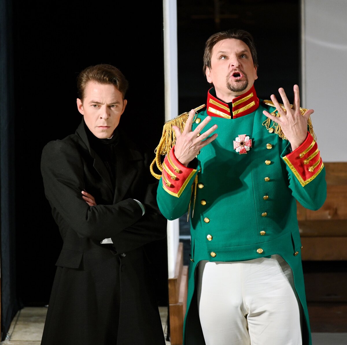 Среди ярких работ на другой, «масочной» стороне заметна пара Наталья Дмитриевна (Елизавета Лапина) и Платон Михайлович (Ярослав Орляченко). Их дуэт – воплощение пошлости супружеских отношений того (хотя и сегодняшнего, чего уж тут) времени.