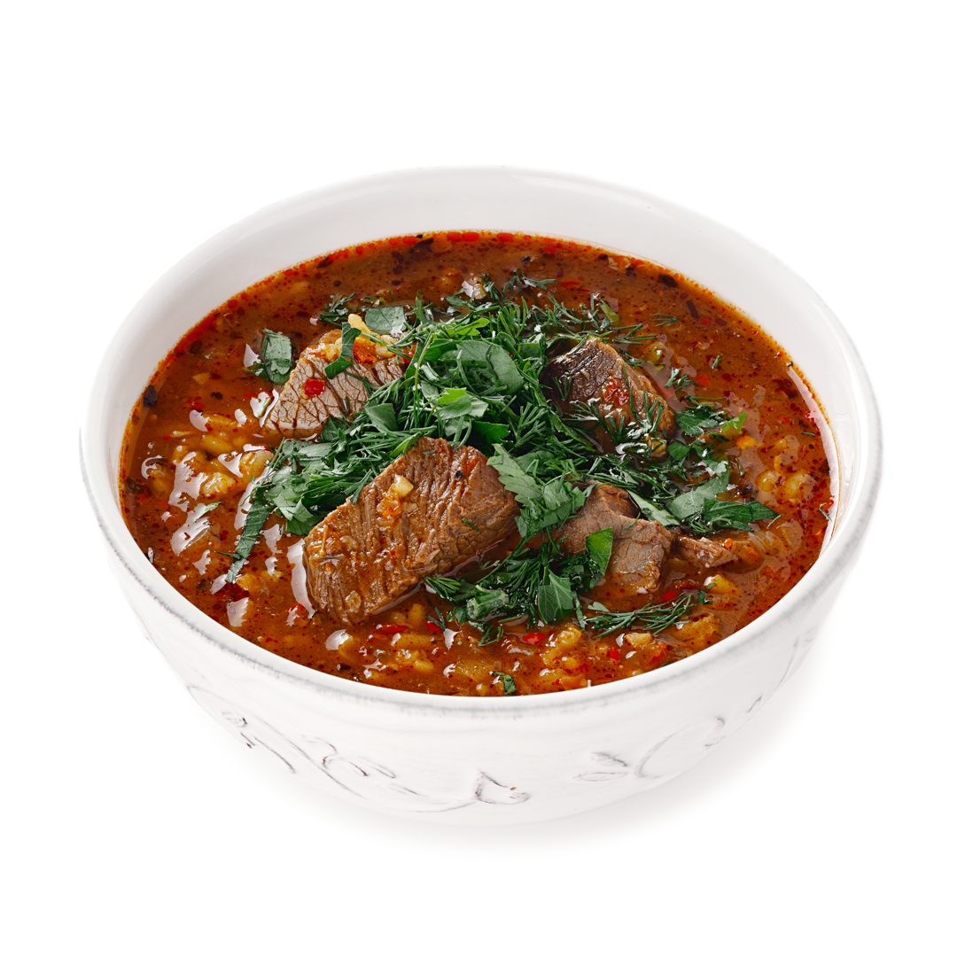 Ингредиенты Способ приготовления Очищаем мясо от костей. В кастрюлю наливаем 2–2,5 литра холодной воды, закладываем мясо и косточки и ставим на огонь. Когда вода закипит, тщательно снимаем пену и уменьшаем огонь так, чтобы вода слегка побулькивала. Оставляем варить на час–полтора. За полчаса до окончания варки в бульон можно добавить корень петрушки или сельдерея и посолить по вкусу. Тем временем, мелко режем лук и обжариваем его в растительном масле на медленном огне, чтобы лук оставался мягким. Как только лук начнет приобретать золотистый цвет, добавляем к нему мясо из бульона и жарим 5 минут. Затем добавляем пару столовых ложек бульона и тушим под закрытой крышкой 15 минут. подготавливаем помидоры. Содержимое сковороды отправляем в бульон,Добавить в содержимое кастрюли рис и продолжать варить. Добавляем Специи На самом конце приготовления добавляем толченый чеснок и мелко рубленную зелень (укроп, петрушку и кинзу). Оставляем час ⏰ настояться. Приятного аппетита 🥘