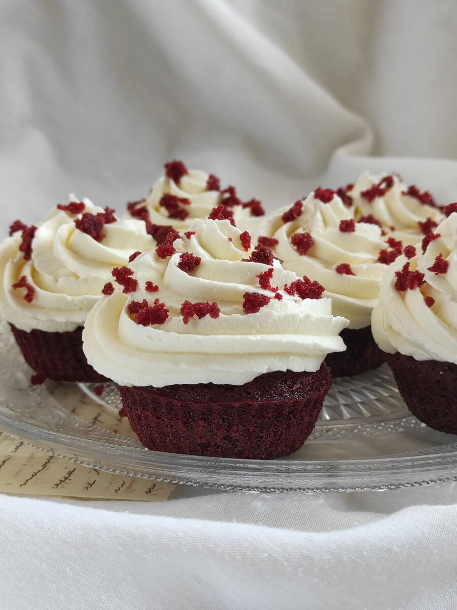 Ингредиенты для 7 штук среднего размера 60 g сахарный песок 85 g сливочное масло комнатной температуры 1 яйцо 8 g какао-порошок без сахара 40 g йогурт 60 g мука 2,5 g разрыхлитель соль - ваниль или ванилин красный пищевой краситель масло для смазывания формочек Крем: 200 гр творожный сыр 150 гр сливки сахарная пудра 🔸🔸Приготовление: Начните взбивать сливочное масло, сахарный песок, ваниль или семена ванильного стручка; добавьте яйцо и снова взбивайте до получения более менее однородной консистенции. Добавьте краситель: количество зависит от качества красителя. Если в виде геля - можно меньше, если жидкий (как в моем случае) - лучше побольше. Добавьте также йогурт и снова все перемешайте. Просейте муку, какао, разрыхлитель (½ чайной ложки), добавьте щепотку соли. Введите сухие ингредиенты к масляной массе и размешайте снизу вверх до полного объединения. Для удобства переместите тесто в кондитерский мешок. Разместите бумажные формочки в форму для маффинов. С этим тестом у вас в