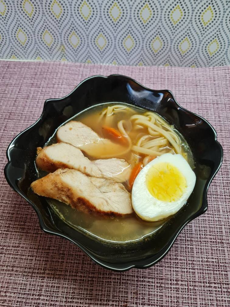 Ингредиенты: Куриный бульон, Куриная грудка, Морковь, Лук, Лапша, Варёное яйцо каждому в тарелку, Соль, специи, зелень , Заправка, Соевый соус, Чеснок, Паприка