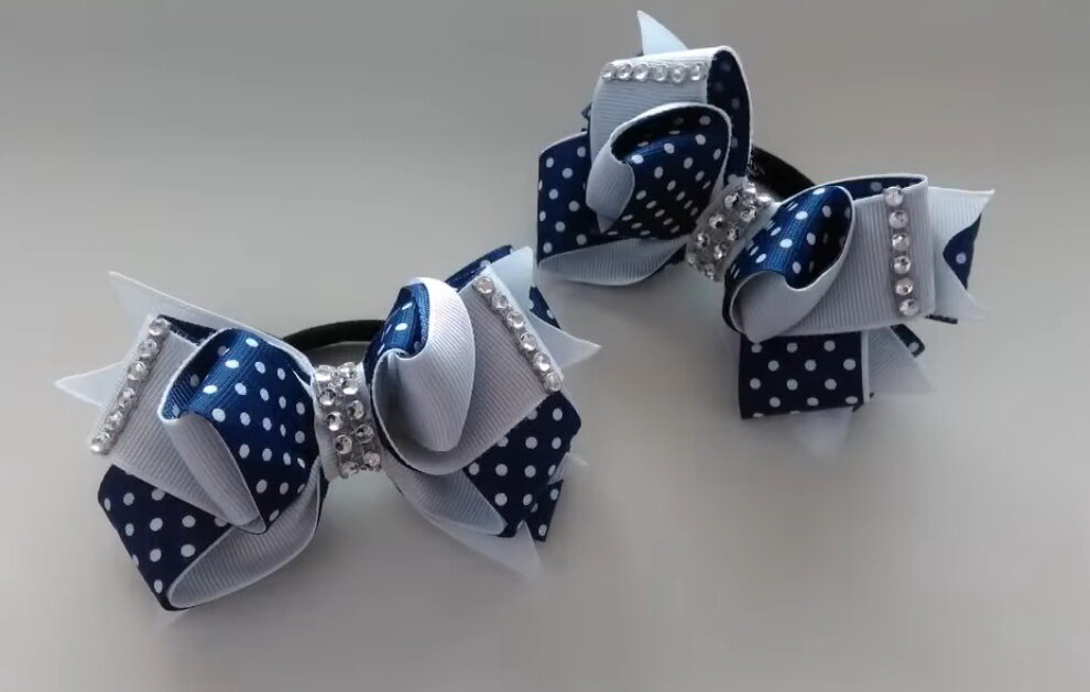 Для изготовления одного бантика нам понадобиться: Для начала нам потребуется 2 отрезка однотонной репсовой ленты шириной 2,5 см длинной по 30 см (как показано на фото 1). Обрезанные ленты опаливаем, чтобы не распускалась лента. Берем репсовую ленту с рисунком шириной 2,5 см и также отрезаем два отрезка по 30 см. Не забываем опаливать концы ленты. Теперь берем и спаиваем ленты разного цвета зажигалкой. Берем одну спаяную ленту и складываем ее пополам, но внизу оставляем зазор в 1,5 см, как на фото 3. Повторяем то, что видим на фото 4. Хвост ленты, которая оказалась снизу заворачиваем как показано на фото 5. В итоге у вас должно получиться как на фото 6. Переворачиваем изделие, у вас должно получиться так же как указано на фото 7. Теперь возвращаем изделие в первоначальное положение, однотонной лентой вверх. Берем "хвост" ленты, которая отведена в лево и заворачиваем ее поверх другой ленты в правую сторону. Должно получиться как показано на фото 9. Следующим движением будет загиб репс