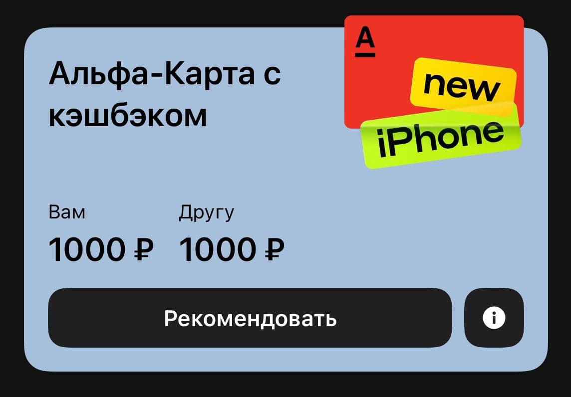 https://alfa.me/6FGacw Оказывается при оформлении карты альфа банк по реферальной ссылке, оба получают по 1000 рублей после любой покупки по полученной карте. Получается заказал, забрал карту, оплатил любой товар и получил 1000. Мне кажется проще условий нет не в одном банке