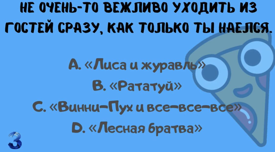 1. Такой вот парадокс: Мы совершаем подвиги для тех, кому до нас нет никакого дела, а любят нас те, кому мы нужны и без всяких подвигов! A. «Смешарики» B. «Снежная королева» C. «Аленький цветочек» D. «Холодное сердце 2» 2. Я не ленивый, я энергосберегающий A. «Железяки» B. «Тайна магазина игрушек» C. «Фиксики» D. «История игрушек 2» 3. Не очень-то вежливо уходить из гостей сразу, как только ты наелся! A. «Лиса и журавль» B. «Рататуй» C. «Винни-Пух и все-все-все» D. «Лесная братва» 4. Цветок, распустившийся в непогоду, редчайшая драгоценность A. «Рапунцель: Запутанная история» B. «Мулан» C. «Маленький принц» D. «Красавица и Чудовище» 5. Даже для чудес необходимо немного времени A. «Холодное сердце» B. «Золушка» C. «Приключения Буратино» D. «Аннабелль» 6. Ты знаешь, что я с тобой сделаю, если ты меня опять обманул. A. «Карлик Нос» B. «Пиноккио» C. «Шрек 4» D. «Головоломка» 7. Человек собаке друг - это знают все вокруг! A. «Леди и бродяга» B. «Бобик в гостях у Барбоса» C. «101 далматинец»