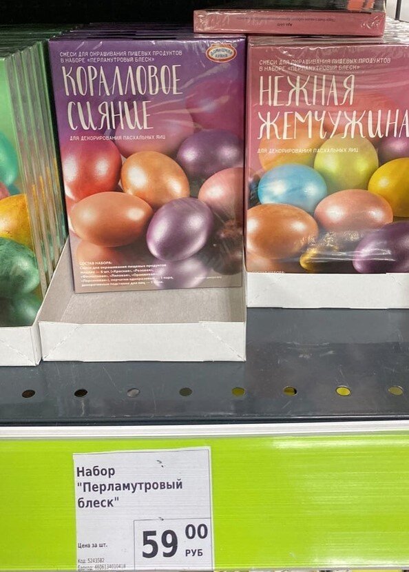 Здравствуйте, дорогие читатели, любимые подписчики и гости канала! Давайте вместе снова заглянем, в такой часто посещаемый всеми, магазин. Смеси для окрашивания "Хамелеон" предназначены для украшения пасхальных яиц. В наборе: сухая смесь – 1 цвет, жидкие смеси – 3 цвета, кисточка – 1 шт., декоративная подставка для яиц – 1 блок. Подробная инструкция по применению указана на упаковке. Товар представлен в ассортименте. Вы можете выбрать смеси для белых или бежевых яиц. Цена 59 рублей. Формочка пасхальная предназначена для выпекания праздничных куличей. В упаковке 6 формочек с разным дизайном, которые прекрасно подходят для подачи готового угощения к столу! Размер: 13х11,2х7,8 см. На этикетке указан рецепт кулича. Состав: мелованная бумага. Цена 99 рублей. Сумочка пасхальная подходит для составления праздничных композиций или оформления подарков и угощений. Выполнена из мягкого материала. Красочный дизайн с цветами подарит весеннее настроение! Размер: 16х6,5х12 см. Состав: полиэстер. Цен