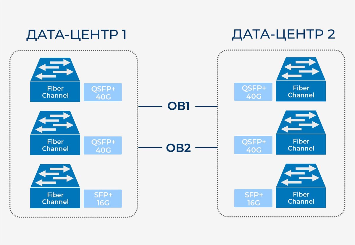 Реализация проекта позволила организовать передачу данных по протоколу Fibre Channel с резервированием оптической линии связи. Техническое задание Соединить две площадки, расположенные друг от друга на расстоянии ~30 км. Обеспечить резервирование по волокнам - обязательное условие ТЗ, то есть работа каналов связи не должна быть нарушена даже в случае обрыва одного из волокон. Суммарная емкость между двумя площадками должна составить 2 канала по 40GE на клиентских портах QSFP+ и один канал FC16G на клиентском порту SFP+ SAN-коммутатора. Исходные данные Между площадками Заказчик арендует 2 оптических волокна в кабелях, проложенных по разным трассам. Решение Определенная сложность проекта заключается в том, что организовать передачу канала с трансиверов QSFP+ в одном волокне не представляется возможным, так как в одноволоконном исполнении такого форм-фактора просто не существует. Что же касается DWDM QSFP+, то упоминание о модулях найти в интернете можно, но для широкого коммерческого исп