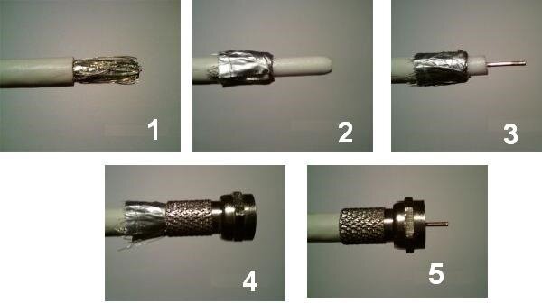 Друзья всем привет ! В данной статье я расскажу и покажу как подготовить телевизионный кабель правильно. Это можно сделать в домашних условиях, своими руками, не применяет никаких специальных инструментов. Достаточно только канцелярского ножа. На картинке наглядно представлены все этапы заделки кабеля под F коннектор. 1. Срезается наружная оболочка кабеля. Делать это надо аккуратно, чтобы не повредить «волосинки». Они выполняют роль минусового контакта, по аналогии с силовым кабелем, который используется для электричества. 2. «Волосинки» загибаются на кабель, как продемонстрированно на рисунке 2. Так-же мнения специалистов разделяются, нужно ли алюминиевую фольгу так-же загибать на кабель или обрезать. Я всегда обрезаю её, и делаю так чтобы корпус F коннектора, контактировал с «волосинками» на прямую. 3. Обрезается внутренняя изоляция и оголяется центральная жила кабеля. Она по аналогии с силовым кабелем, выполняет роль плюса. 4. Берётся F коннектор и закручивается на кабель по резьбе.