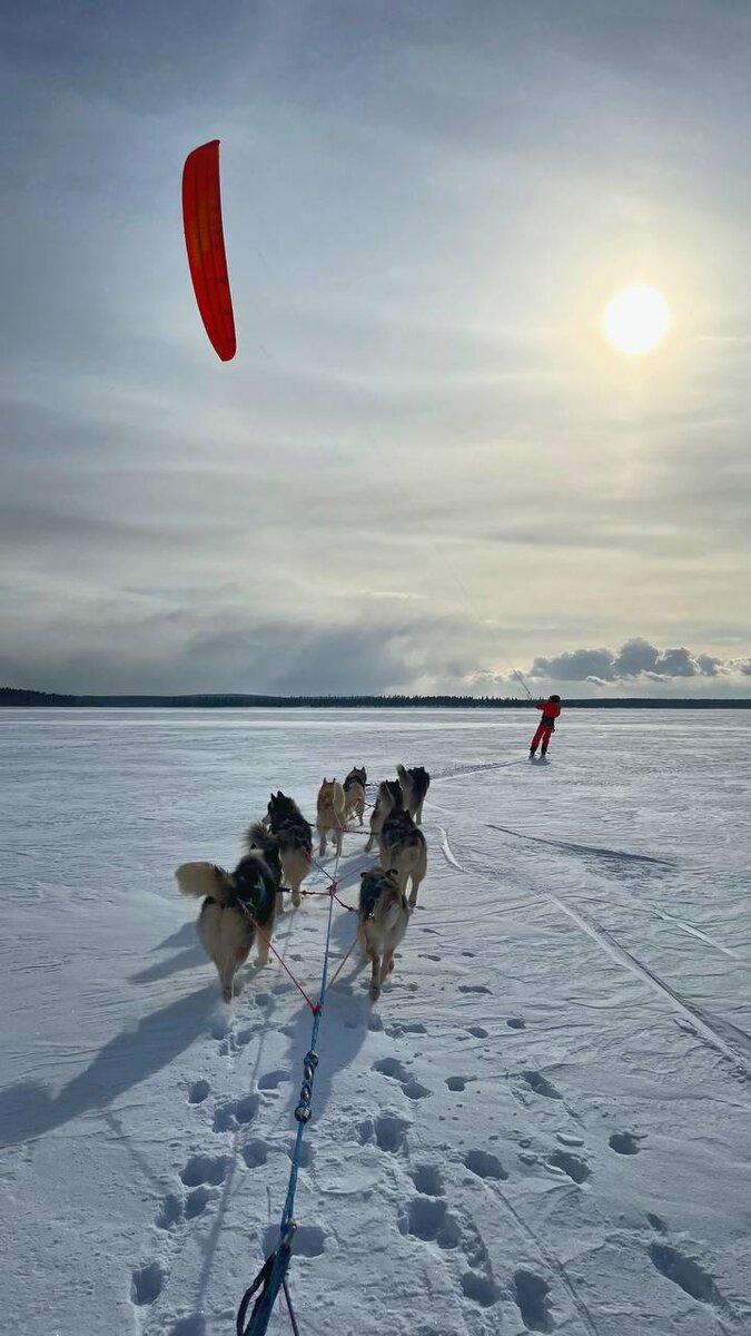 Сегодня выползли к обеду на озеро Экостровская Имандра. Вышли на простор и помчались по солнышку. На озере народу полно, снегоходчики, лыжники, рыбаки, кастеты, и вот последние, две штуки, догнали нас внезапно, свистя стропами, и давай кружить рядом. Собакам любопытно, смотрят диву даются, что за парус, что за взлетающие люди. Мужикам весело, мы для них диковинка тоже, забавно, что собаки бегут за ними. В какой-то момент один из них таки спросил: «А мы не мешаем вашим собакам?» Я даже не нашлась, что ответить. Объективно - да, но по сути, мы на отдыхе и нам совершенно не важно, куда именно бежать по озеру. Однако, когда наши пути разошлись, у нас все же возникла проблемка. Я неоднократно рассказывала, что собаки, гонимые вперёд инстинктом, совершенно обнуляются по мозгам, когда предлагаешь им идти вперёд без видимой (движущейся) цели впереди. Кошка у меня отлично навигировалась по следам снегоходов и лыжников, но пока мы гнались за кайтерами, мы ушли в ту часть озера, где, если и были
