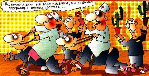 В общем, взяли препаратов, чтоб в новогоднюю ночь клиентура не отвлекала, кастеты - в карман халата, так просто, чтобы были и, разбившись по двое, пошли на разведку. Зашли в «буйное». Всё в порядке - орут, как и положено буйным. Вязки проверили – крепко, до утра выдержат. Обещают покромсать в салат, но увидев шприц, смущаются и умолкают. Ну, вкатили, кому по дозе аминазина, кому – галоперидолчик, а кому и коктейль из этих чудодейственных препаратов, чтобы ужастики не мерещились.