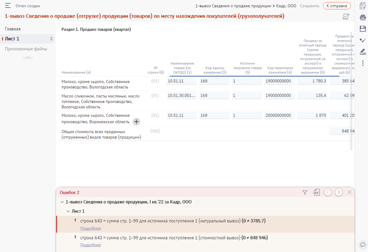 В форме по статистике 1-вывоз часто можно наблюдать не совсем понятный протокол проверки. Обычно начальная картина такая - вы заполнили нужные коды товаров. В качестве кода территории получателя указали нужные области России. Указали суммы. При проверке выходит ошибка, представленная ниже. Не совсем понятно, что это за строка 643. В отчете ее нет. Для исправления ошибки нужно дополнительно указывать для каждого кода ОКПД2 строку с кодом получателя 643 и суммарными значениями по этому коду. Исправленный вариант ниже.
