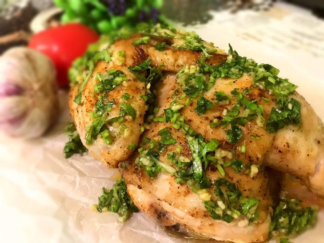 Ингредиенты: тушки курицы, Соль, чёрный молотый перец , Из специй у меня: аджика сушенная, хмели-сунели, молотый кориандр, сливочного масла, свежей кинзы, чеснока