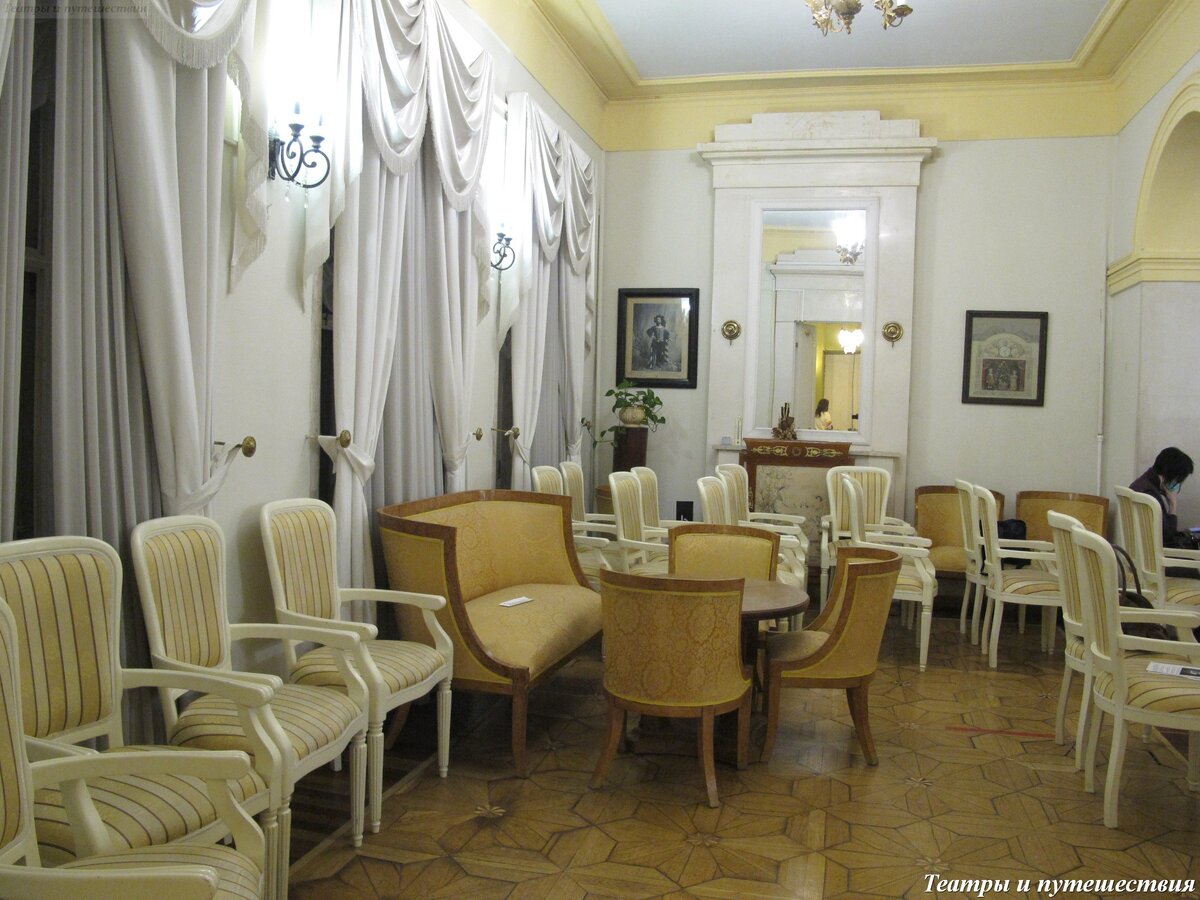 Я вам уже рассказывала про театральные встречи, которые проводят Друзья балета вместе с музеем Бахрушина? В самом-то музее Бахрушина в Замоскворечье я была один раз всего, еще до всяких всемирных бактерий. Зал там, как говорят, переоборудован из сарая и выглядит соответственно. Вот тут можно посмотреть. А теперь Бахрушинский музей закрыт на ремонт, и общение артистов с восторженными зрителями перенесено в музей Ермоловой на Тверском бульваре. Фокус в том, что театральные встречи проходят по понедельникам, когда у музея выходной. Понятно, что выходить на работу в свое свободное время у сотрудников причин нет никаких, потому они только обеспечивают проверку билетов. Про бытовые подробности – они все на 1 этаже – смотрите предыдущий отзыв. Театральная гостиная на 2 этаже. Вернее сказать, это высокий 1 этаж, потому что для входа надо спуститься в полуподвал. Поднимаемся по главной лестнице – дом-то небольшой, это же не вилла современной супер-пупер-звезды массовой культуры. И лестница то