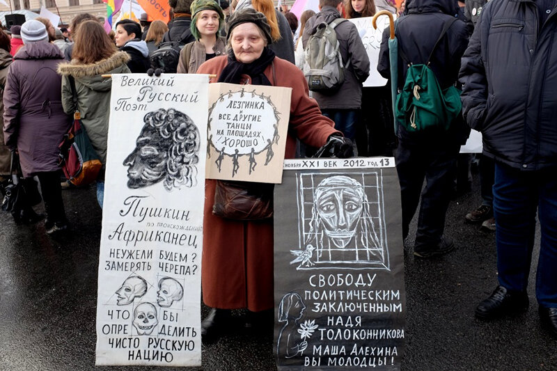 Блокада Ленинграда началась 8 сентября 1941 года. Ленинград был окончательно освобождён от блокады 27 января 1944 года. 78 годков после освобождения прошло. Кака- така блокадница? Пожилая женщина активно принимает участие в несогласованных акциях со своими картинами-плакатами. Помню, меня насмешил плакат про лезгинку )) И почему-то Пушкина приплела. Я вспомнила эту бабушку, которая стояла с картинами в стиле лубка или детского рисунка на улице. И что её назвали лицом протестов в Петербурге. И даже "совестью Петербурга". Ну, это либералы, в основном. Любили попиариться на старушке. Судьба у нее сложная, сына 20 лет назад потеряла. И начала ходить с плакатами. Среди людей, всё-таки. 20 лет она стояла с плакатами и всем было безразлично. И тут вдруг статьи, интервью и почётное гражданство славного города Милана.